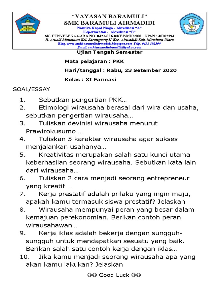 Pendidikan Kewirausahaan (PKK) merupakan mata pelajaran esensial bagi siswa Sekolah Menengah Kejuruan (SMK) di kelas XI semester 2. Pada tahap ini, materi PKK biasanya telah memasuki ranah yang lebih mendalam, berfokus pada implementasi konsep kewirausahaan dalam praktik nyata. Memahami berbagai jenis soal yang akan dihadapi dalam ujian semester 2 adalah kunci untuk meraih hasil maksimal. Artikel ini akan menyajikan pembahasan mendalam mengenai contoh soal PKk kelas XI semester 2, dilengkapi dengan analisis dan strategi pengerjaan yang efektif, dengan target panjang tulisan sekitar 1.200 kata.